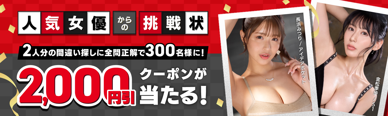 上記の期間中に間違い探しを解いて「クイズに回答する」ボタンから回答をご応募頂くと、抽選で300名にFANZA動画クーポンをプレゼント。